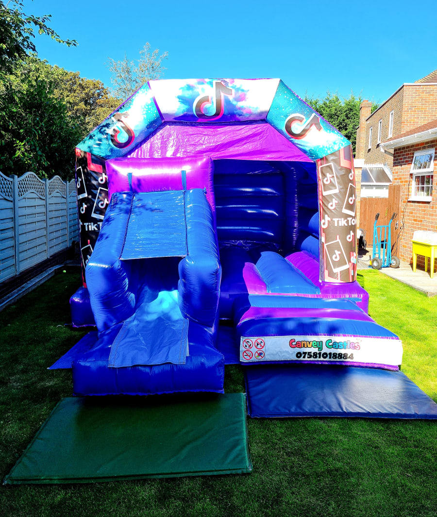 Don't miss out on the fun! Book the 12ft x 17ft Blue and Purple Tik Tok Slide Combo Bouncy Castle with Canvey Castles in Essex for your next event. Contact us today to secure your booking and let us help make your event one to remember!