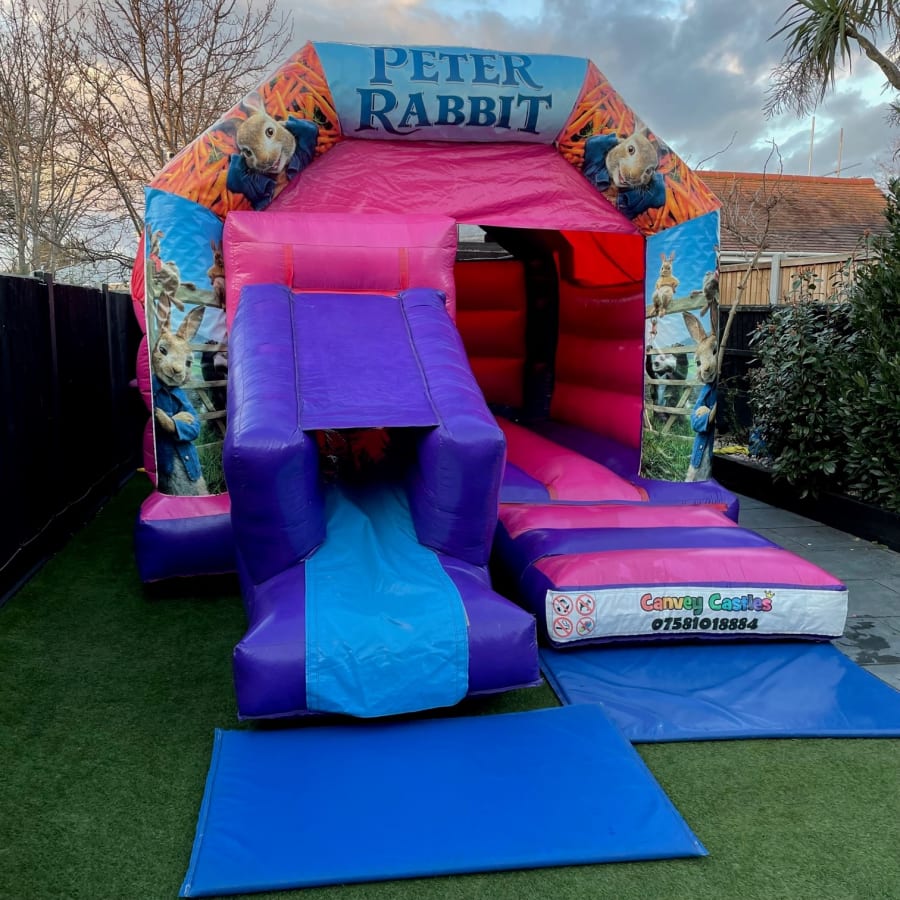 Delight Your Little Ones with the 12ft x 17ft Pink and Purple Peter Rabbit Slide Combo Bouncy Castle