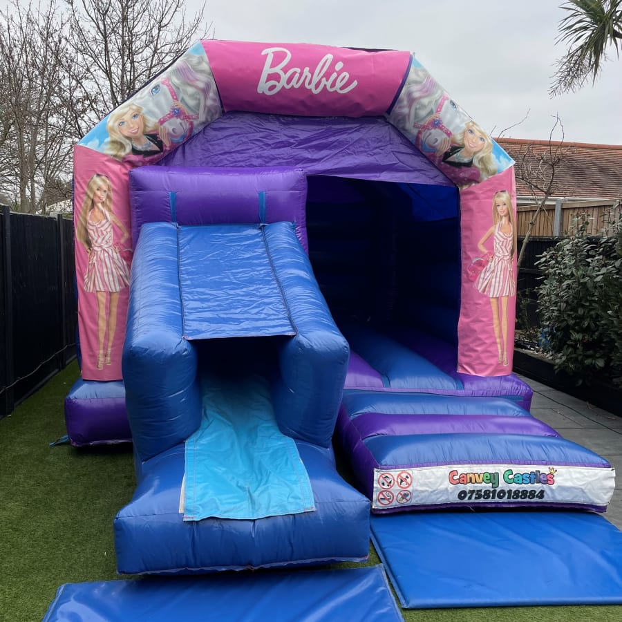 Make your next event unforgettable with the 12ft x 17ft Blue and Purple Barbie Slide Combo Bouncy Castle from Canvey Castles in Essex. Let the fun begin!