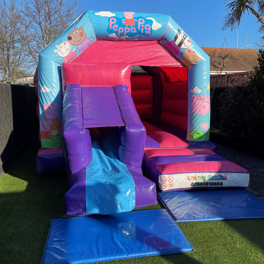 Transform any event into a magical experience with the 12ft x 17ft Pink and Purple Peppa Pig Design 2 Slide Combo Bouncy Castle in Essex, exclusively offered by Canvey Castles. This vibrant and enchanting bouncy castle is perfect for children who adore Peppa Pig, offering hours of entertainment and adventure. Whether it's a birthday party, school event, or community gathering, this combo castle is sure to be the highlight of the day!