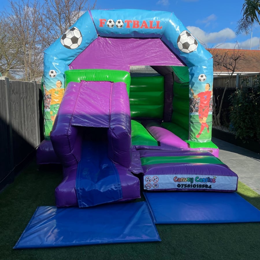 Elevate your next event with the 12ft x 17ft Green and Purple Football Slide Combo Bouncy Castle. This vibrant and engaging bouncy castle promises endless entertainment, making it a must-have for any party or gathering in Essex. Crafted to capture the imagination of young sports enthusiasts, this combo bouncy castle blends thrilling slides with the timeless joy of bouncing, creating an unforgettable experience for your guests.