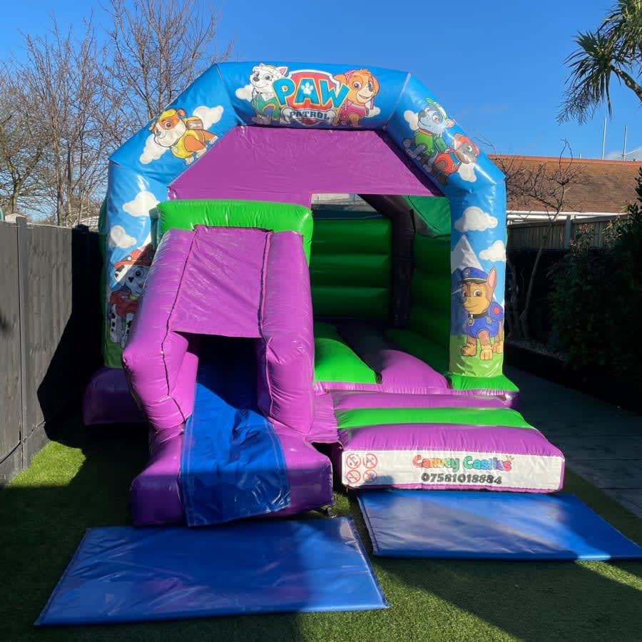 Experience Endless Fun with the 12ft x 17ft Green and Purple Paw Patrol Slide Combo Bouncy Castle