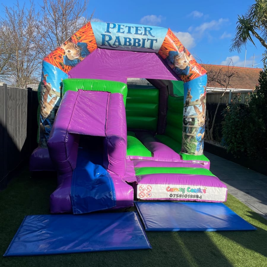 Don't miss out on the fun! Contact us to secure your booking and make your event a memorable one. We offer reliable delivery and setup services across Essex, ensuring a hassle-free experience. Choose our Canvey Castles 12ft x 17ft Green and Purple Peter Rabbit Slide Combo Bouncy Castle in Essex to provide an unforgettable experience for all your guests.
