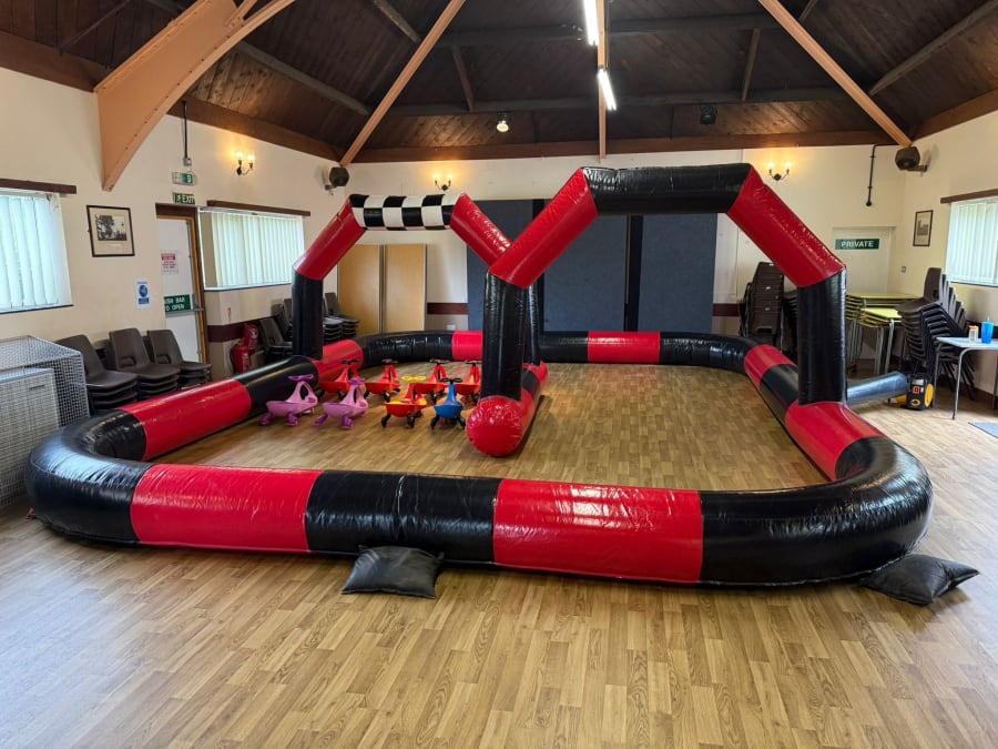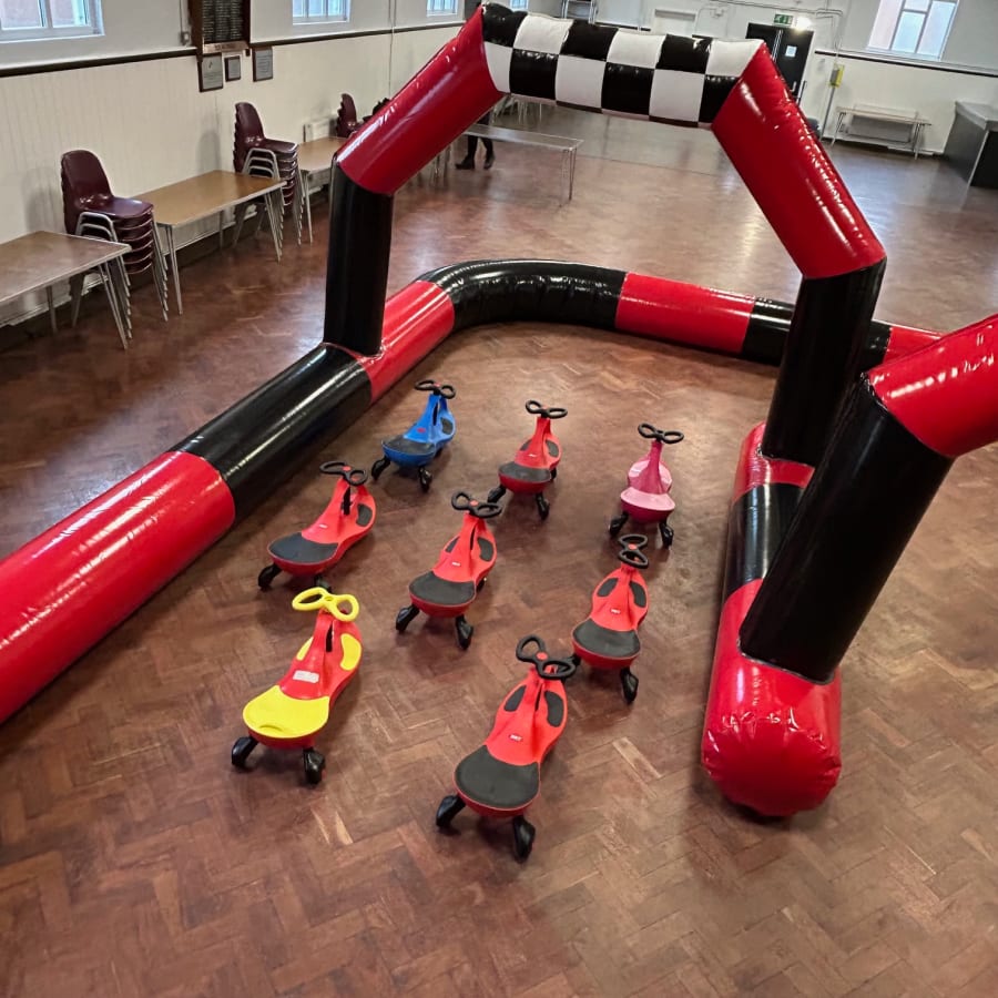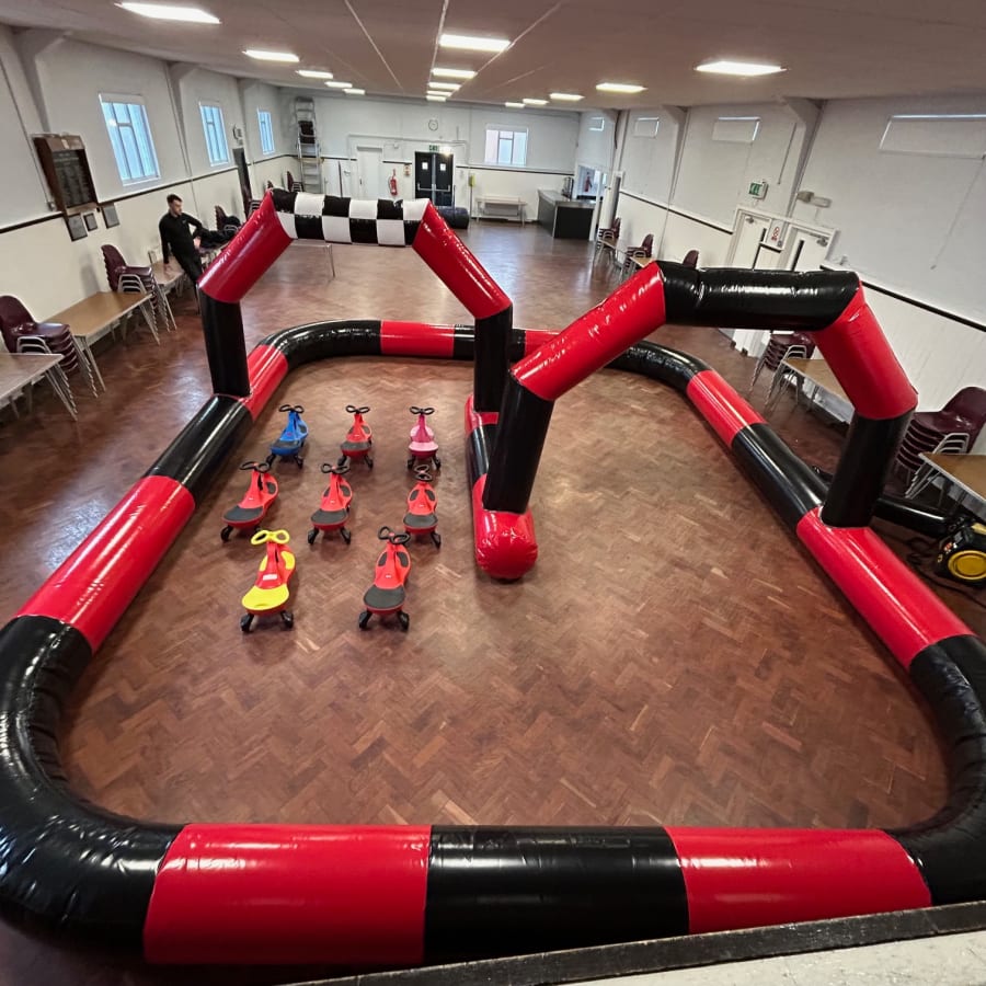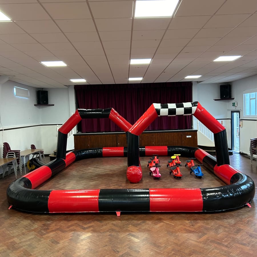 Get ready for an adrenaline-fueled racing experience like no other with our black and red themed Didicar Race Track! This is the ultimate Grand Prix race track that will have you and your opponents vying for victory. Hop on these self-propelled go-cart-like cars, known as Didicars, and prepare to zoom around our huge inflatable track. With their unique design and easy maneuverability, all it takes is a simple turn of the wheel to move forward and backward. Perfect for children of all ages, this thrilling activity will keep everyone entertained. Whether you're hosting a birthday party or looking for some indoor fun, our Didicar Race Track guarantees hours of excitement. We provide everything you need – an inflatable track measuring 20ft x 25ft and eight Didicars. All you need to do is bring your competitive spirit! So gather your friends or family members, put on your racing gear, and get ready to rev your engines. Book our Didicar Race Track today for an unforgettable experience filled with speed, skill, and endless laughter. Remember: this exhilarating adventure can only be enjoyed indoors.