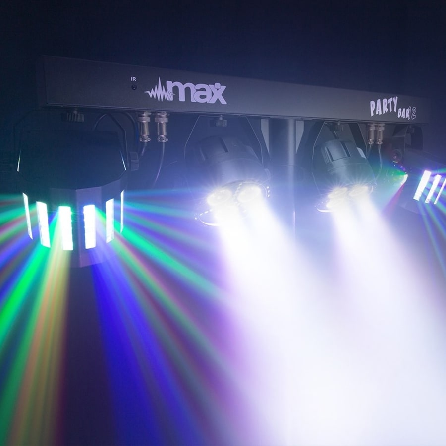 The Partybar2 is a complete DJ lighting solution fitted with 2 PAR Cans with high-intensity RGBW LEDs and 2 Derby lights. This Partybar2 can be controlled via DMX, IR remote control or auto and sound-activated programs selectable from the control panel. A tripod stand is included for quick and easy setup is adjustable from 1310mm to 1690mm. Specially designed for stages, parties, entertainers and all other special events.