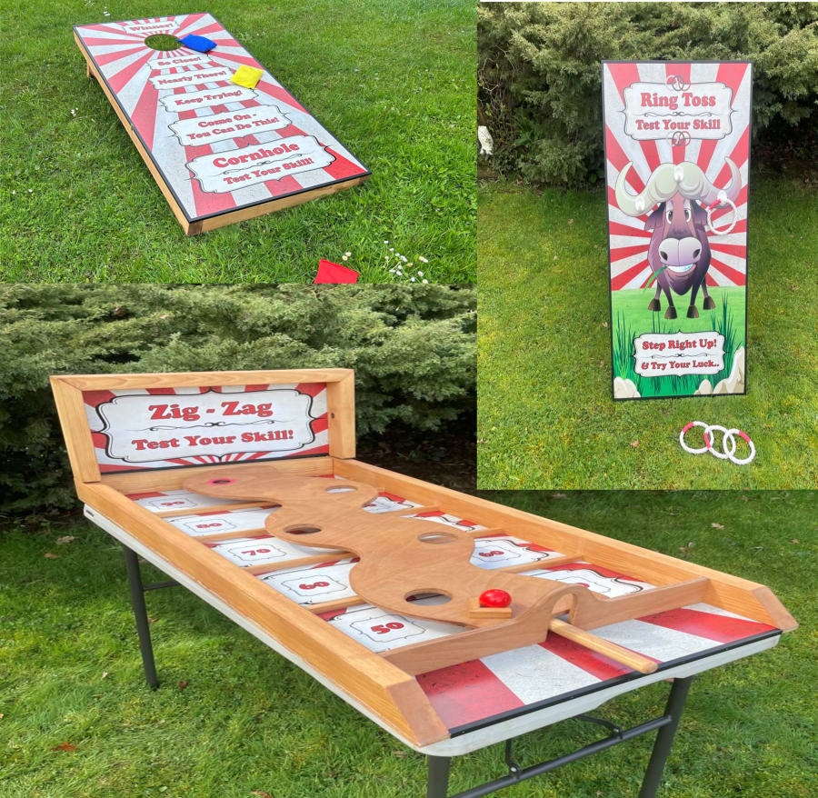 Get ready for the ultimate gaming extravaganza! Introducing Games Combo Package One, a thrilling selection of games that will have everyone on their feet. This package includes the Zig zag table top game, the bull design ring toss game and the bean bag throwing cornhole game.Whether you're planning a birthday bash or a corporate event, our games hire service is perfect for all party occasions. With just a few clicks online or by contacting our friendly team today, you can confidently reserve your chosen date and get ready to experience non-stop fun. Don't miss out on this opportunity to create unforgettable memories with family and friends - book now before it's too late!