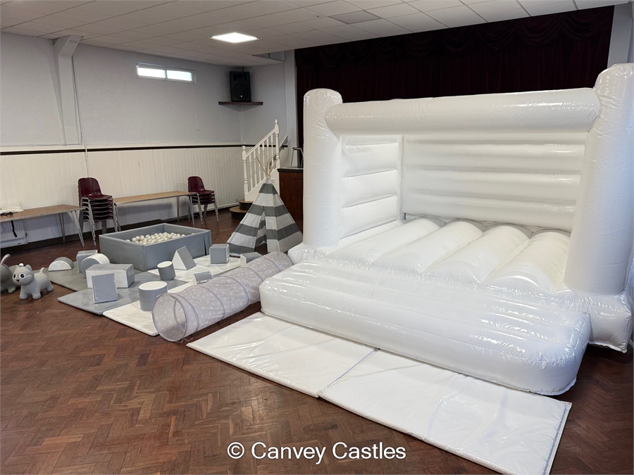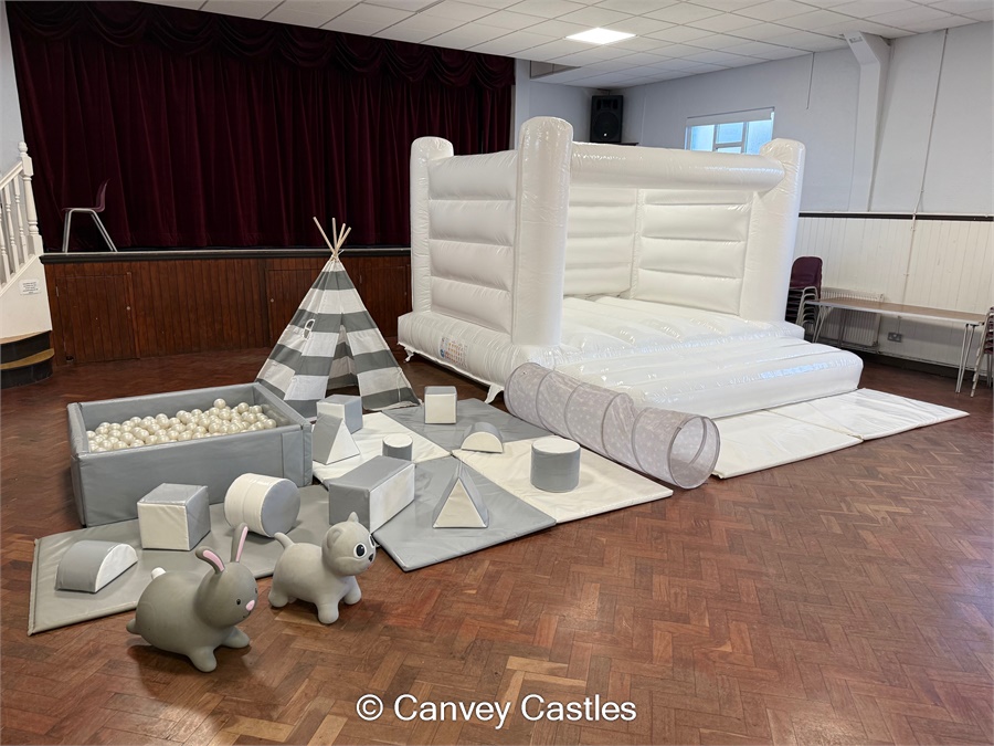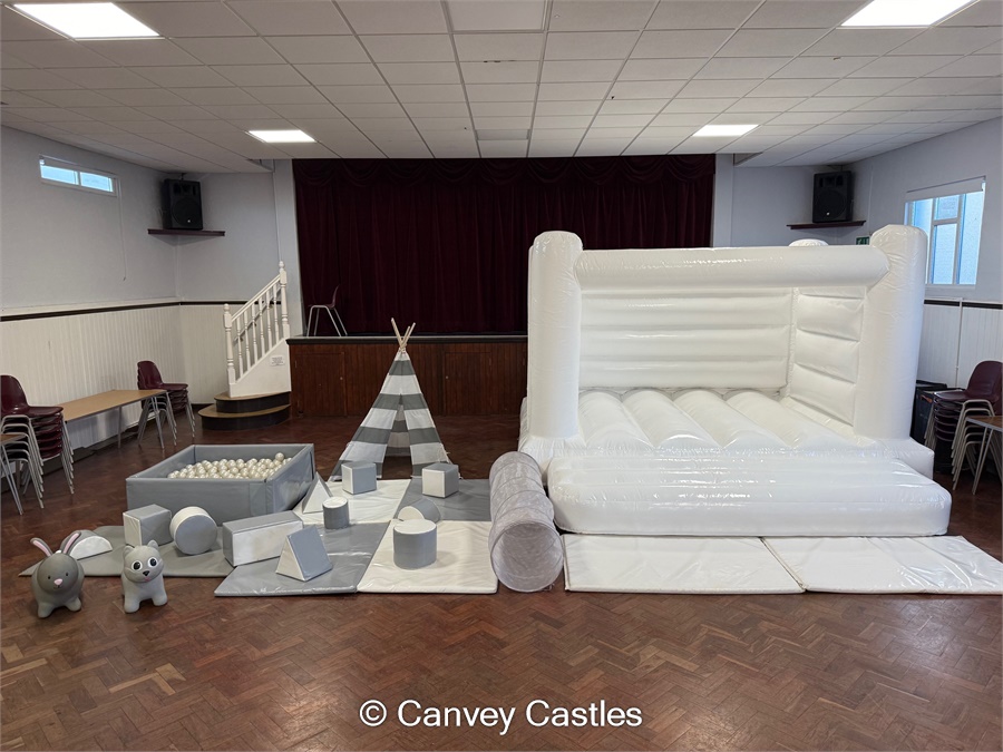 canvey castles White Pastel Party Package 1 in essex delivers a stylish, safe play zone for toddlers and young children. This package pairs a 12ft x 12ft low height white castle with white and grey softplay. It suits birthdays, nurseries, community events, and family parties across essex seeking modern, minimalist fun that parents trust.